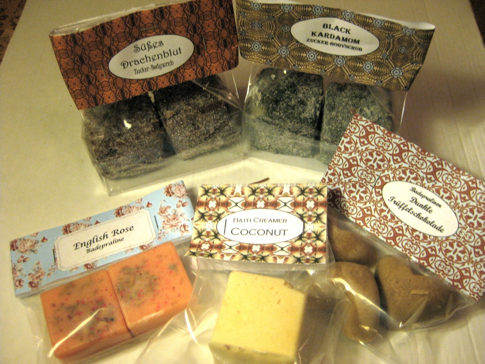 Jede Teilnehmerin der Seifenkind-Gruppe durfte in eine Liste ein Öl, ein ÄÖ, Farbe und besondere Zutaten eintragen und die Seife durfte dann nur aus diesen Zutaten bestehen. In meiner Seife ist Babassu, Palmöl (rot), Shea, Olive, Mohn, Seide, Vollmilchpulver und die ÄÖs Orange, Eukalyptus und Melisse. Leider hat die Melisse das OrangenÄÖ komplett überdeckt und ich hatte so gehofft, dass das Eukalyptusöl die Orange etwas fixiert.....:-(( Aber das mit dem Mohn sieht ganz hübsch aus finde ich :-))